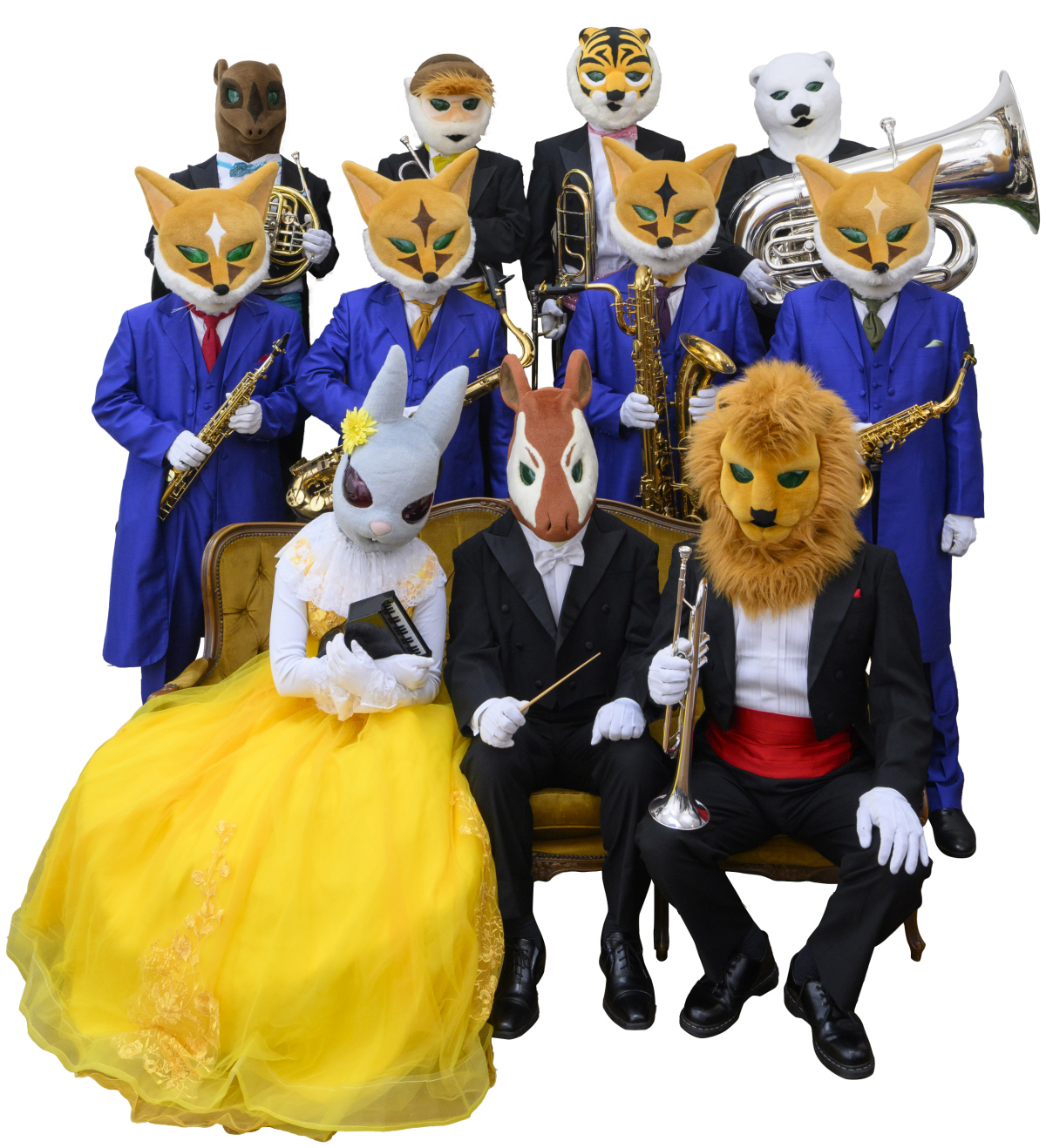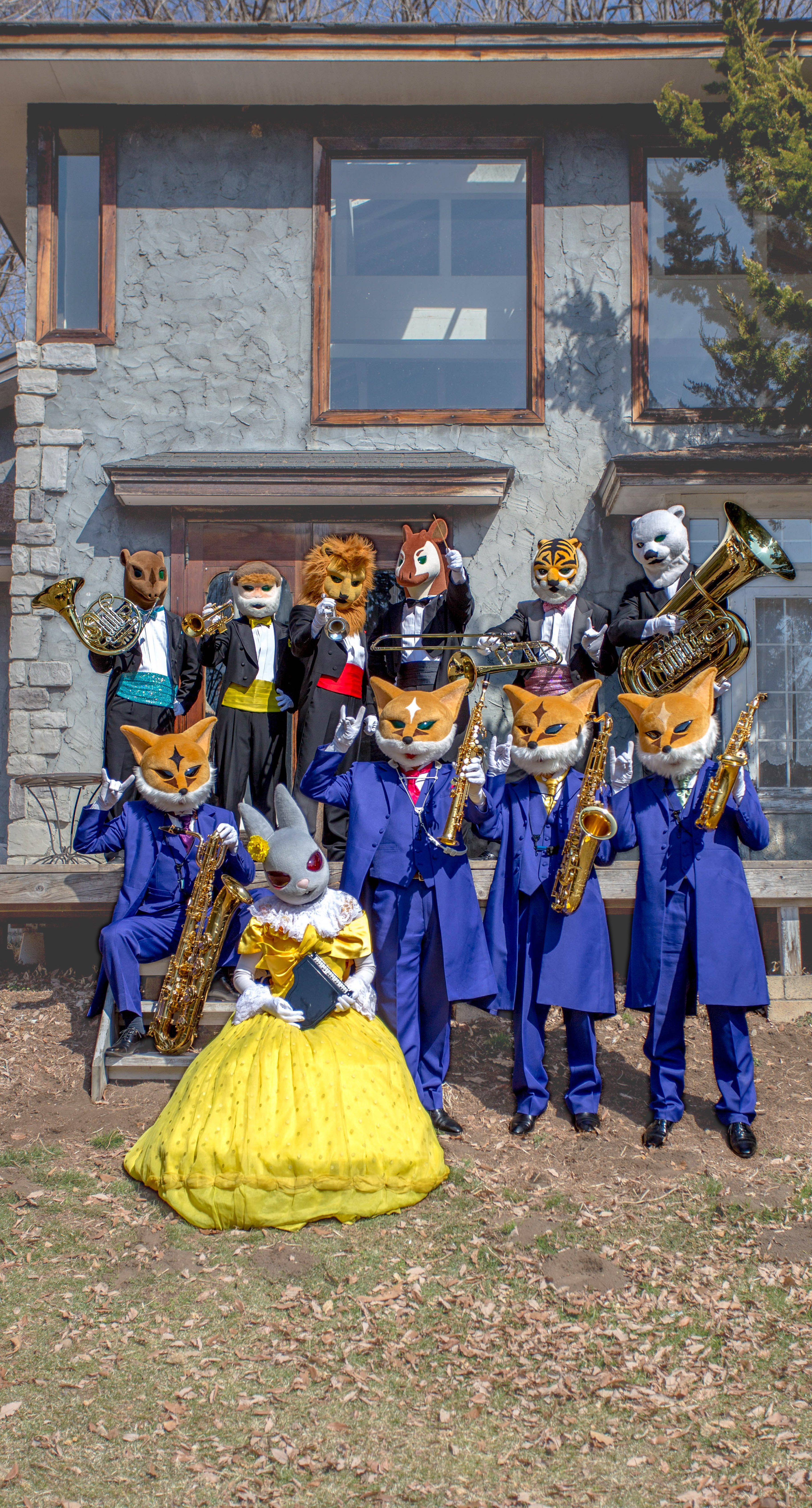 写真、左からマレーバク(ホルン)、ドゥクラングール(トランペット)、インドライオン(トランペット)、オカピ(指揮者)、スマトラトラ(トロンボーン)、ホッキョクグマ(チューバ)