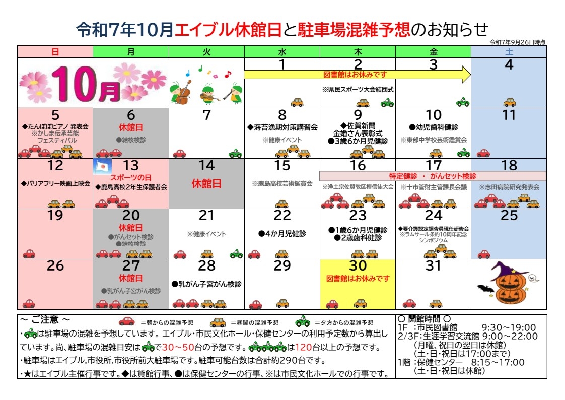 令和7年10月の駐車場混雑予想です。(令和7年9月26日時点)