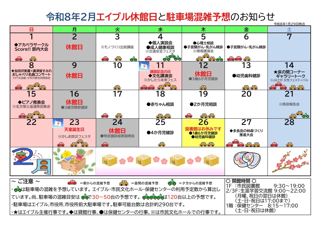 令和8年2月の駐車場混雑予想です。(令和8年1月29日時点)