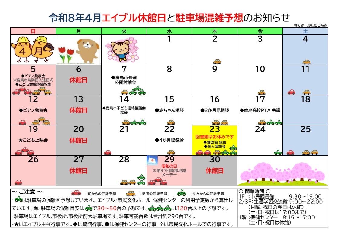 令和8年4月の駐車場混雑予想です。(令和8年3月30日時点)